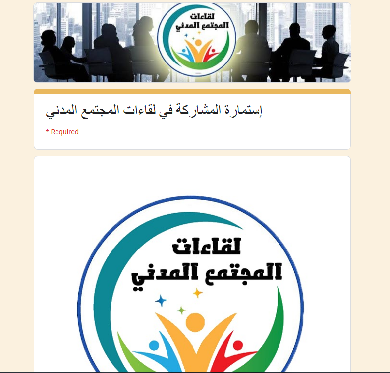 رابط الاستمارة للمشاركة في لقاءات المجتمع المدني: https://docs.google.com/forms/d/e/1FAIpQLSeuJu7_HuiFPy9GnXdLZKwlY4PlDwaJrcAcWxgd9oExjL3gCQ/viewform?fbclid=IwAR07dpULeKJhhBpjkYyXEt8coUr5o9bxoEeNRJKix5Ue_LiDRepnfMJlz24