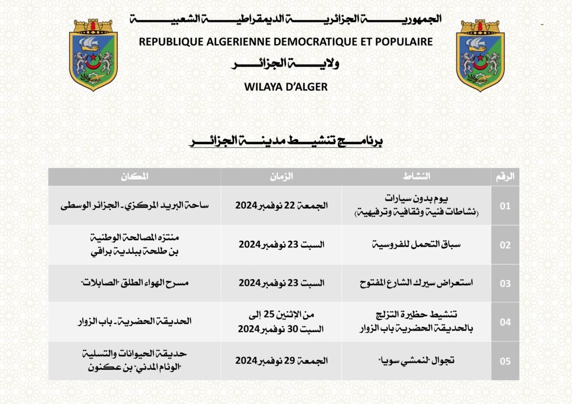 تستعد ولاية الجزائر لإطلاق برنامجها التنشيطي الذي يتضمن مجموعة متنوعة من الفعاليات الموجهة لكافة الفئات العمرية. يتميز البرنامج بالجمع بين الأنشطة الثقافية، الترفيهية والرياضية، بهدف تعزيز الروح الجماعية وتحفيز المشاركة الفعالة لسكان العاصمة وزوارها، لفائدة الأطفال والعائلات والشباب، خلال عطل نهاية الأسبوع. فيما يلي تفاصيل الفعاليات التي ستقام خلال الأيام القادمة: