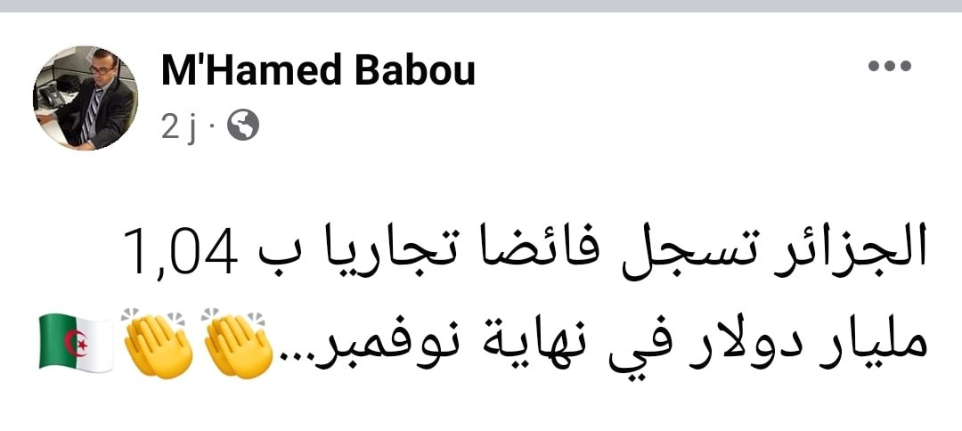 هذه الأشياء مع ارتفاع نسبي في سعر المحروقات الذي في حد ذاته كان للجزائر دور كبير فيه…….كل هذه الأشياء ساعدت الجزائر في ان تحقق فائضا قدره 1,04 مليار دولار …👏👏👏.