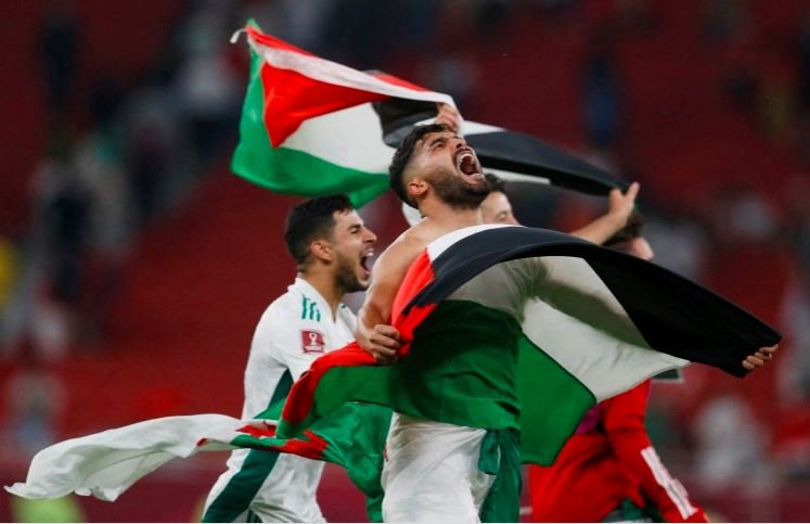 علم فلسطين يزين احتفال لاعبي الجزائر ومحرز يحتفل بالفوز على المغرب