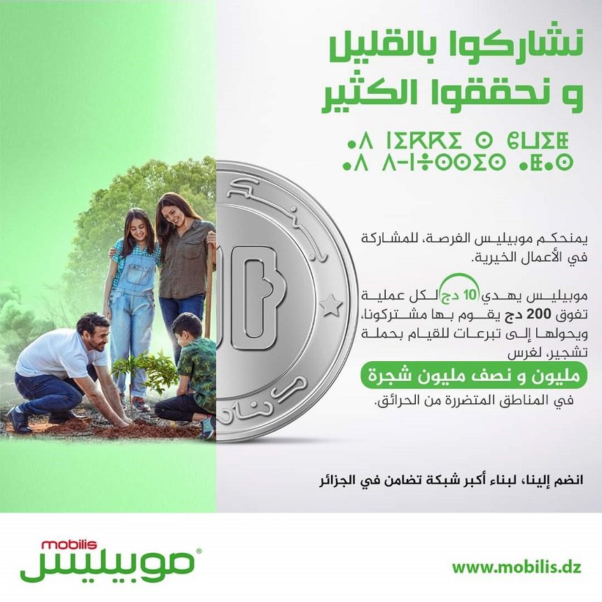 وقرر موبيليس اقتطاع 10 دج (على عبئ المتعامل) عن كل عملية تفوق 200 دج، وتحويلها إلى تبرعات للقيام بحملة التشجير.