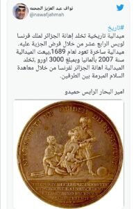 شارك باحث كويتي، متابعيه عبر تويتر صورة لميدالية تاريخية ساخرة، تخلّد إهانة الجزائر لملك فرنسا لويس الرابع عشر.