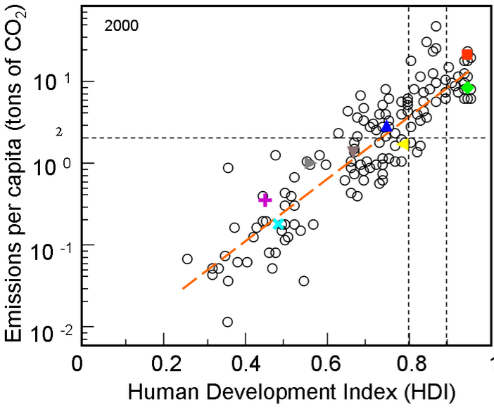 بالنظر إلى الارتباط الإيجابي والزمني بين مؤشر التنمية البشرية (HDI) وانبعاثات ثاني أكسيد الكربون للفرد من احتراق الوقود الأحفوري ، فقد انخفض ترتيب الجزائر في التنمية البشرية العام الماضي.من المركز 82 إلى المركز 91 في العالم بعد أخذ الانبعاثات في اعتبار لحساب المؤشر.