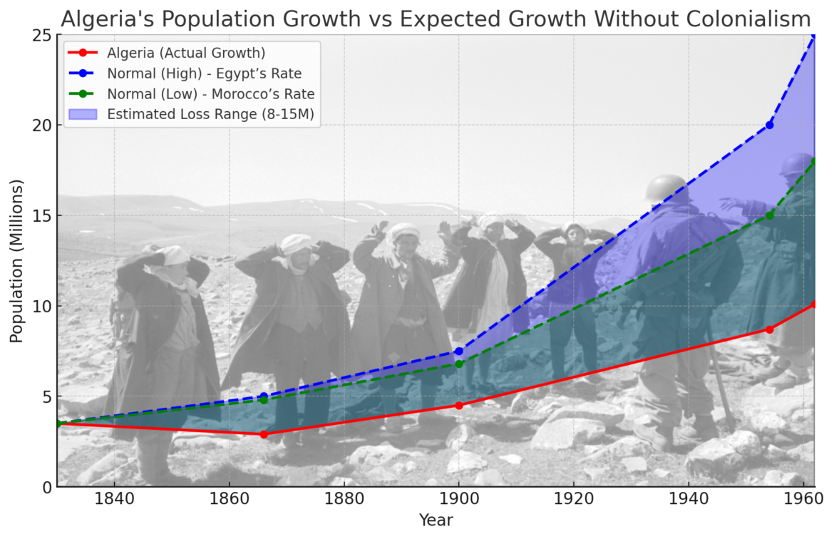 If Algeria had grown at Egypt’s rate (1.3%), its 1962 population would have been ~25 million, and if it had matched Morocco’s rate (1.1%), it would have reached ~18 million (McCarthy, 1990). This suggests that colonialism cost Algeria between 8 and 15 million lives in unrealised demographic potential.