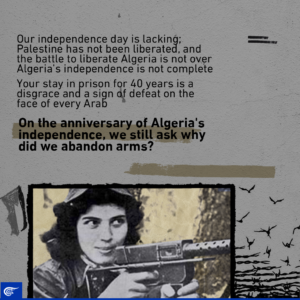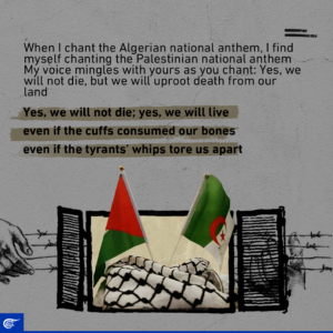 “When I chant the Algerian national anthem, I find myself chanting the Palestinian national anthem.” Read Djamila Bouhired’s letter to the Palestinian prisoner Karim Younes.