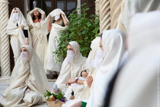 The Algerian women usually wear El Hayek outside home either daily (especially older women) or in different occasions like weddings, funerals or other circumstances. In the wedding parties in the past, the bride must be dressed in El Hayek before leaving the family home. Although it is almost rare nowadays to meet a woman dressed in El Hayek but it is still present on the displays of shops reserved for bridal trousseaux because some conservative families continue to demand the Hayek in the dowry of the bride, and even some grandmothers carefully preserve this traditional dress, hoping to offer it one day to their granddaughters on their wedding day. Today, though the Hayek still holds a large place in our society, just very few women wear it because it can no longer fulfill the social functions of our new contemporary era.
