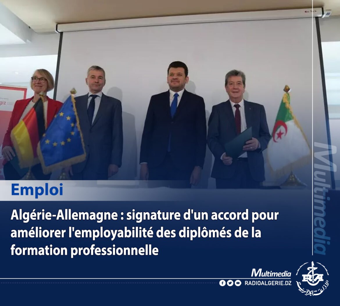 La cérémonie de signature, présidée par le ministre de la Formation et de l’Enseignement professionnels, Yacine El Mahdi Oualid, et l’ambassadeur d’Allemagne en Algérie, Georg Felsheim, a vu la participation du Secrétaire général du ministère, Allaoua Boulkemh, et de la Directrice résidente du bureau de la GIZ en Algérie, Martina Vahlhaus. Cet accord marque une étape clé dans la mise en œuvre de réformes ambitieuses dans le secteur de la formation professionnelle en Algérie.