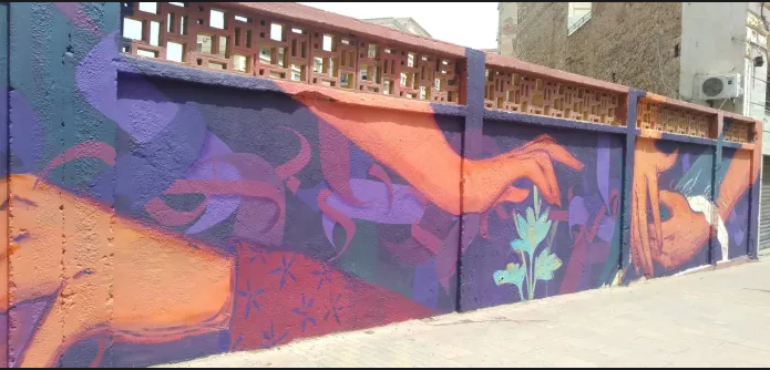 Set ou Oussama Abdelkarim Harachif, 23 ans, a, lui, réalisé une fresque horizontale en semi- figuratif sur un mur de clôture entre deux immeubles au boulevard de la Soummam, non loin de l’hôtel Royal, où dominent l’orange feu et le violet vif. La fresque, réalisée avec l’artiste LMNT, évoque la protection de la nature et la solidarité.