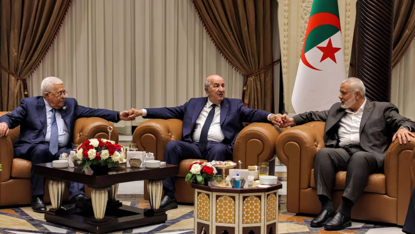 Le président algérien Abdelmadjid Tebboune a organisé une rencontre entre Ismaïl Haniyeh, chef du Hamas, et Mahmoud Abbas, le chef de l’Autorité autonome dans la soirée du mardi 5 juillet. Alger TV a qualifié cette rencontre d’historique, mais n’a pas annoncé son contenu. Selon le rapport, Tebboune et Abbas ont signé un document pour donner à une rue de Ramallah le nom d’Al-Alger.