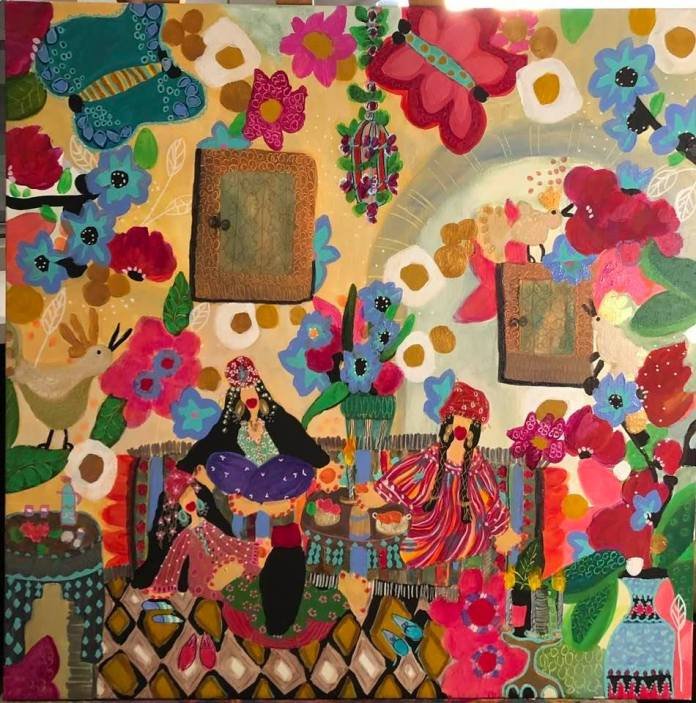 Des couleurs fortes, joyeuses, des femmes aux cheveux longs (comme son père imaginait la beauté dit-elle) dont elle peint les bouches en coeur, elles jouent de la musique avec ould et bendir, dansent, prennent le café dans un jardin sous un arbre paradisiaque, assises sur un tapis prêt à s’envoler vers le ciel.