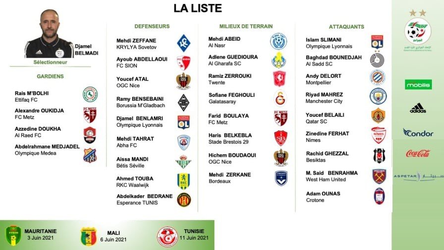 Alors que l’Algérie doit affronter la Mauritanie (3 juin), le Mali (6 juin) et la Tunisie (11 juin), Djamel Belmadi a annoncé sa liste ce samedi.