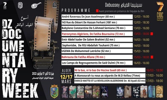 Cet événement comptera notamment les documentaires, “André Ravereau”, de Jean Asselmeyer, “143 Rue du Désert” de Hassan Ferhani, “Babylone Constantine” de Sid Ahmed Semiane, “Emir Abdel kader ” de Salem Brahimi, “Sophonisbe, Reine sacrifiée de Cirta” du regretté Abdallah Touhami, “UGEMA” de Mohammed Latréche, “Les Camps de Regroupements” de Said Oulmi, “A Mansourah tu nous as séparés” de Meriam Dorothée Kellou et “Enrico Mattei et la Révolution algérienne” de Ali Ayadi.