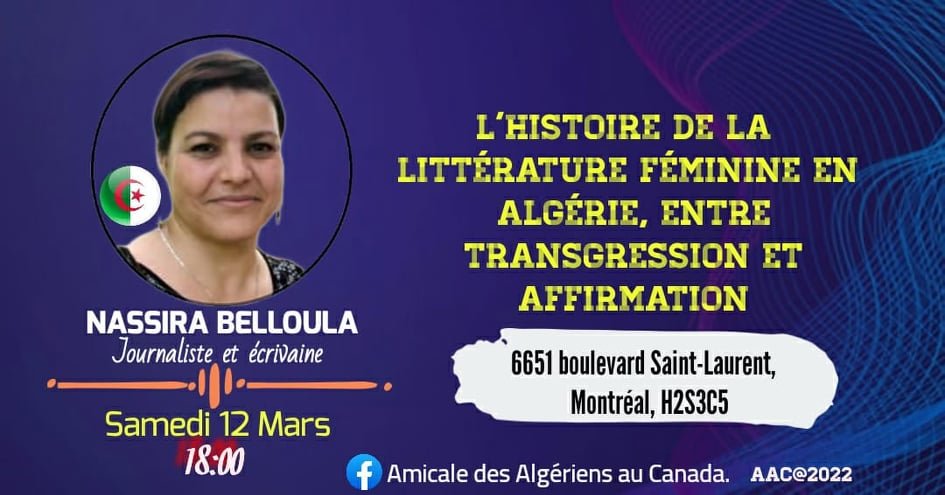 À l’occasion des festivités du 60e anniversaire de l’Indépendance de l’Algérie (1962) qui se dérouleront tout au long de l’année 2022, l’Amicale des Algériens au Canada (AAC) a le plaisir de vous inviter à sa première conférence qui sera présentée par notre amie, Madame Nassira Belloula, journaliste et écrivaine.