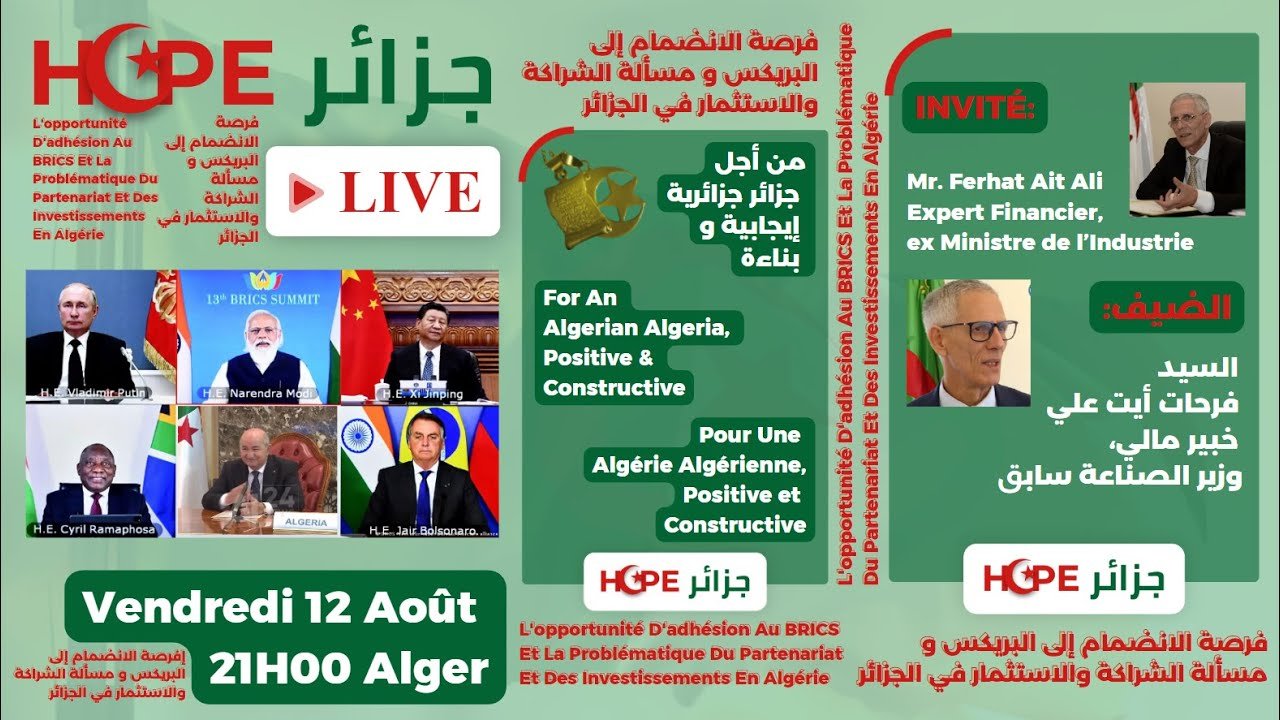 C’est dans une atmosphère conviviale, que Monsieur Aït Ali, très détendu et maîtrisant les sujets abordés nous livre ses réflexions sur l’opportunité d’une adhésion de l’Algérie au BRICS, la nouvelle loi sur les investissements et bien d’autres questions de première importance.