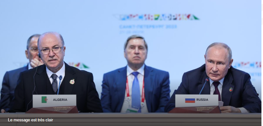 Dans une allocution lue en son nom par le Premier ministre, Aïmene Benabderrahmane, lors d’une séance ayant regroupé des chefs d’État et de gouvernement, présidée par Vladimir Poutine, le président Tebboune a indiqué que l’Algérie aspirait à un «partenariat afro-russe fort et mutuellement bénéfique, à même de permettre la réalisation des aspirations et attentes de nos peuples à davantage de progrès et de développement, et l’émergence d’un ordre mondial juste, basé sur le respect des principes du droit international et du multilatéralisme».