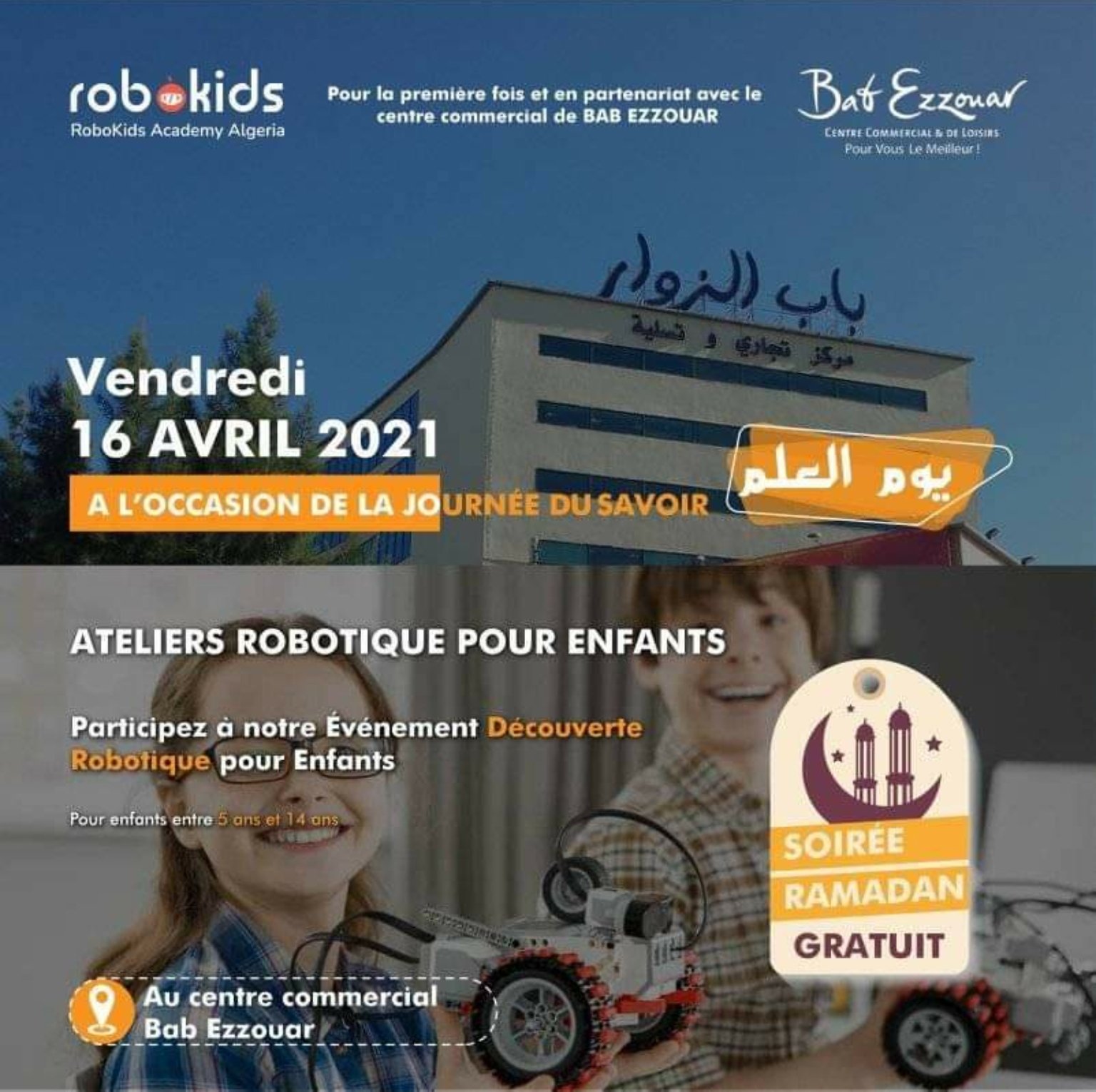 📢Nouveauté!!!🎉🎉 Robokids Academy Algeria en partenariat avec le Centre Commercial Babezouar 🎇organise un évènement éducatif et ludique dédié à la découverte de la robotique🤖 pour les enfants et les jeunes entre 5 ans et 14 ans!👭