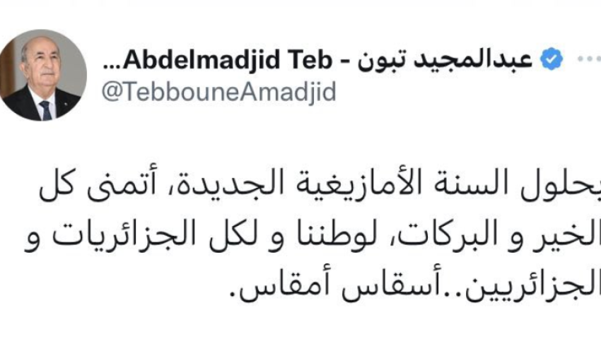“A l’occasion du nouvel an amazigh, je souhaite bonheur et prospérité à notre patrie, ainsi qu’à toutes les Algériennes et tous les Algériens. Assegas Amegaz”, a tweeté le Président Tebboune.